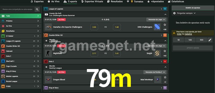 O 79m oferece uma grande seleção de opções de apostas em e-sports com probabilidades competitivas